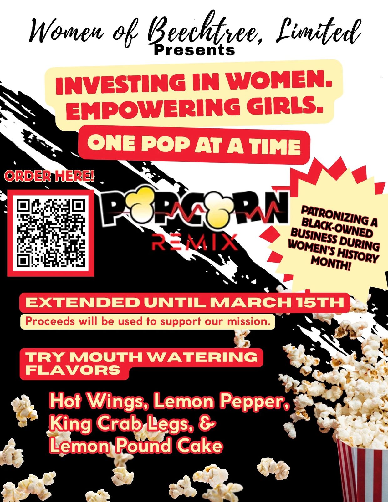 Women of Beechtree, Limited is thrilled to announce that our POPCORN REMIX Fundraiser is now underway. From March 1st through March 10th, every purchase helps us advance our mission to invest in women and empower girls.